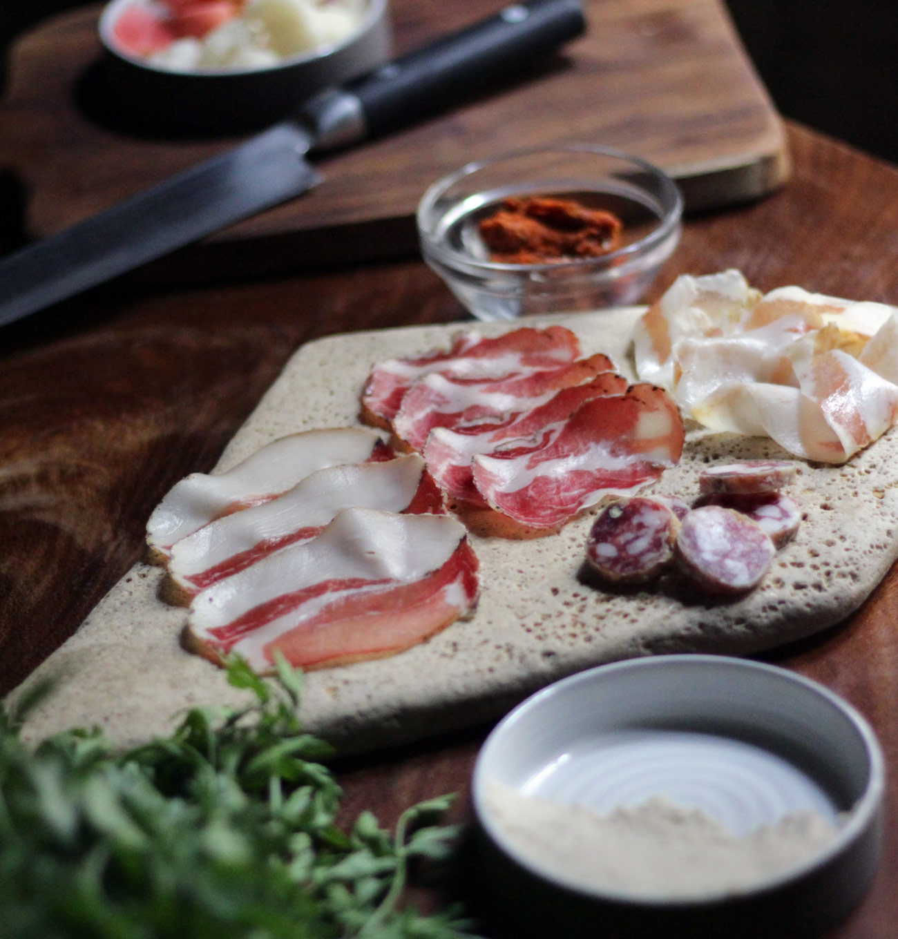 Podreu acompanyar les pizzes amb embotits, com el pernil brasejat amb fusta d’alzina o la mortadel·la trufada, que elaboren de manera artesanal, a partir de la carn de porc gascó. Un animal molt escàs i criat de forma ecològica a la granja Dpagès, a Olius (Solsonès)