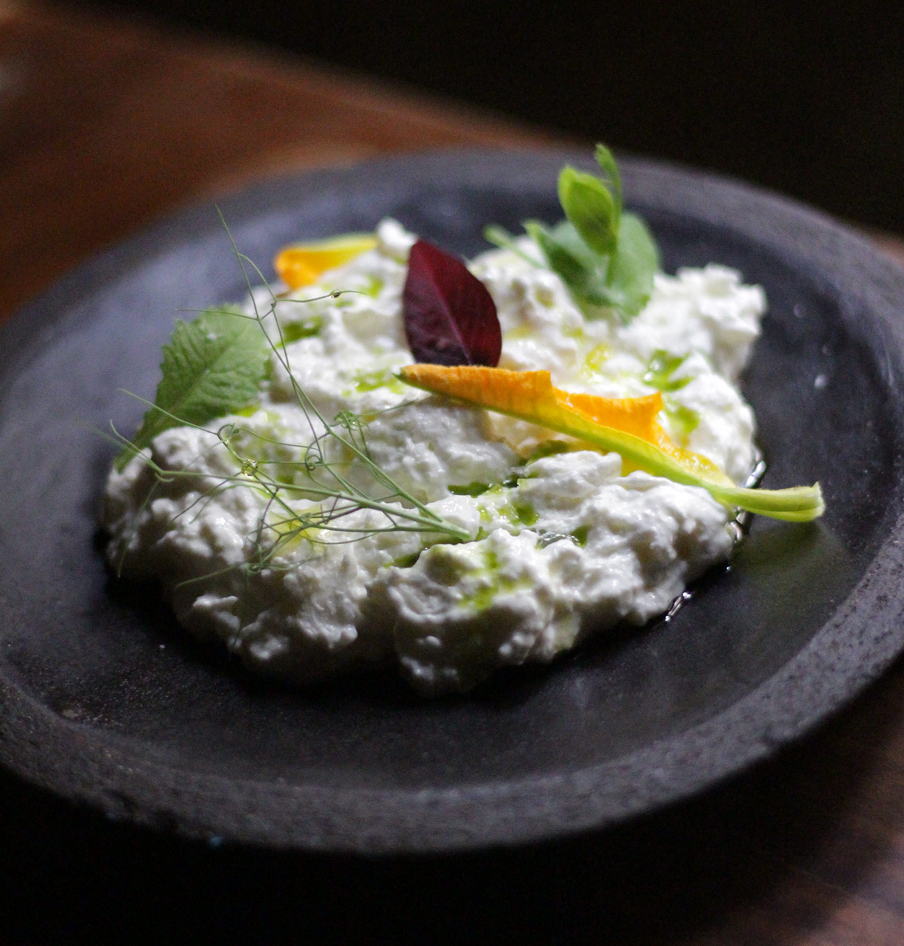 També hi ha entrants vegetals, procedents d’agricultors locals, com els cabdells amb gremolata i picada d’avellana i els seus clàssics com la burrata amb capugliato de tomàquet sec, oli d’alfàbrega i tòfona. Tots ells, habituals en la seva carta.